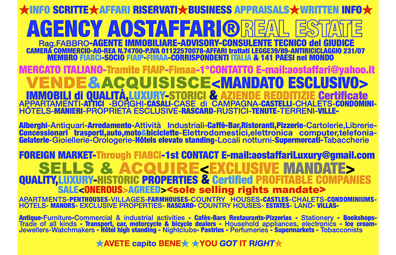 AFFARI PERIZIATI INFO SCRITTE CONFIDENZIALI – 1°contatto:aostaffariLuxury@gmail.com COMPRAVENDITA IMMOBILI di QUALITÀ-Luxury COSTO dal 2% – spese dall’1% – PROGETTATE Acquisto,VENDITA CARD®FIDELITY – Permuta, NUDA PROPRIETÀ? MANDATO ESCLUSIVO VENDITA GARANTITA CESSIONE AZIENDE REDDITIZIE CERTIFICATE – COSTO dal 4% – spese dal 2%