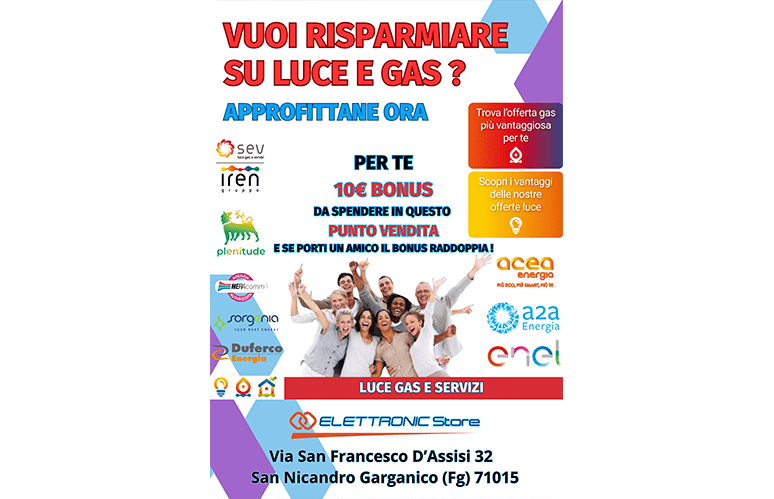 Attiva con noi Luce o Gas ti consiglieremo l’offerta più conveniente e avrai un buono spesa del valore di 10€ da spendere su www.elettronicstoreweb.it oppure in negozio da Elettronic Store e se porti un’amico il bonus raddoppia. (N.B. il bonus è valido solo dopo che si è entrati in fornitura)